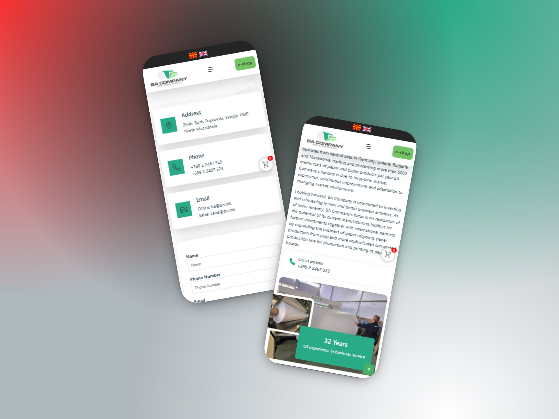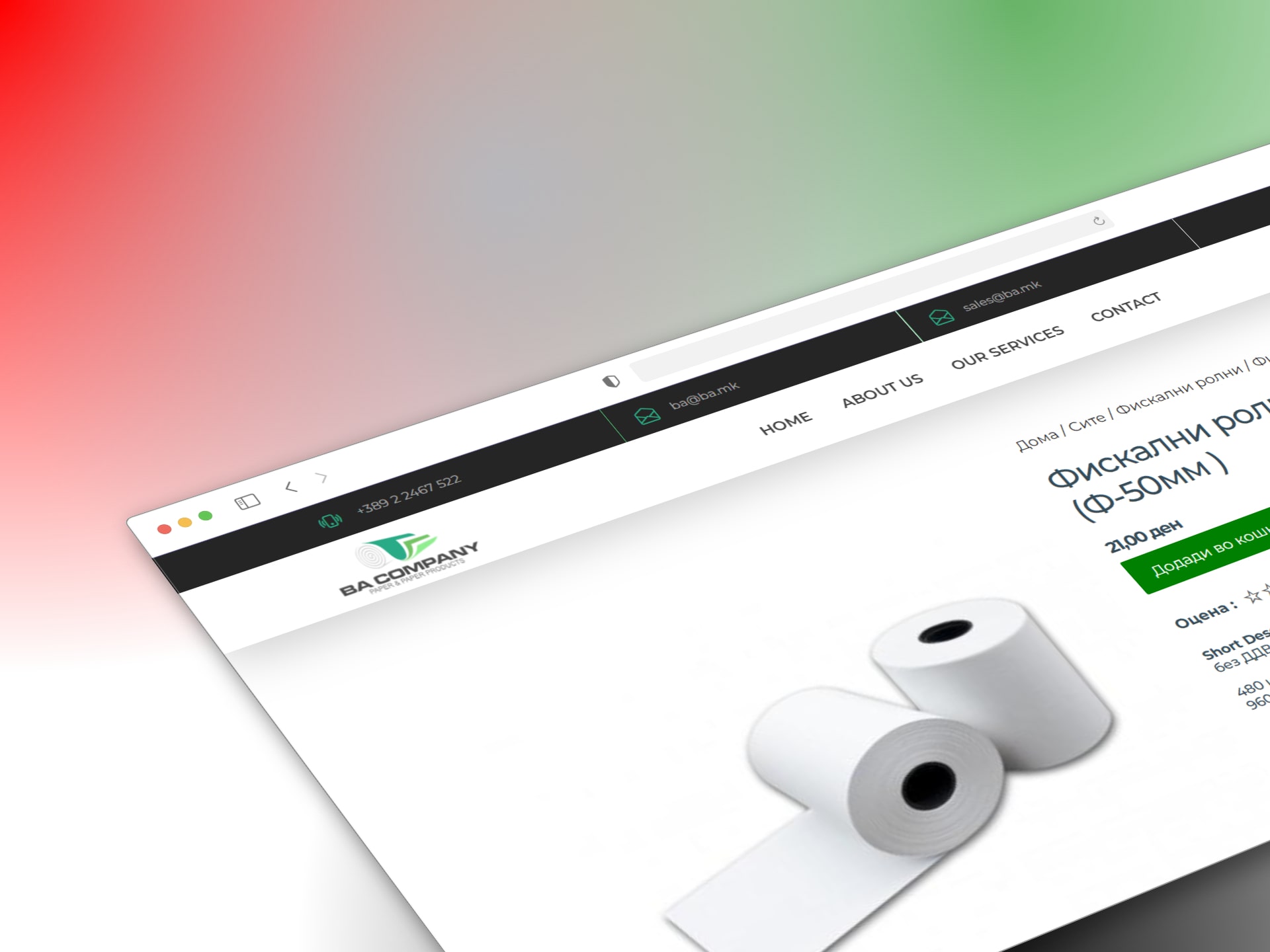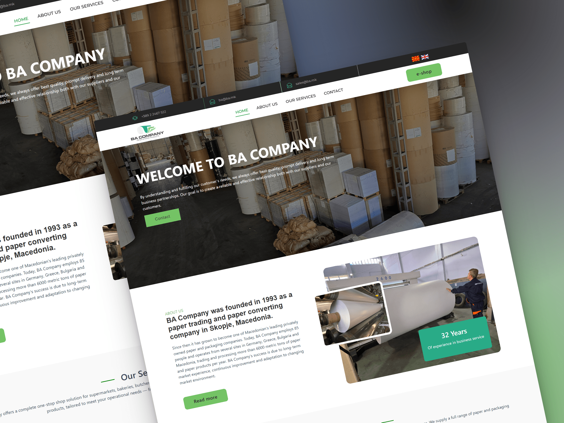 BA Company is a Macedonian paper and packaging supplier that needed a professional website to present its services and enable online sales. The goal was to design and develop a clean, modern, and fully responsive website that communicates trust and showcases their product range while allowing customers to make direct purchases through an integrated E-Shop.