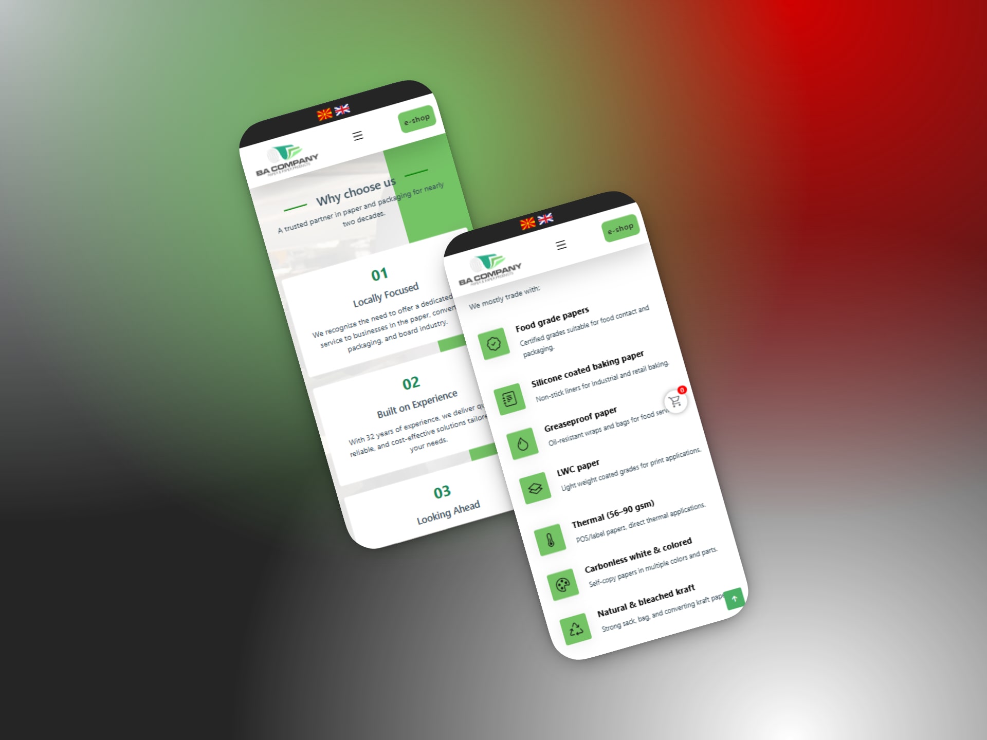 BA Company is a paper and packaging supplier based in North Macedonia. The website was designed as a multi-page business and e-commerce platform, combining a clean visual identity with functionality for both product presentation and online sales. It features a fully responsive layout, allowing seamless browsing and purchasing across all devices.