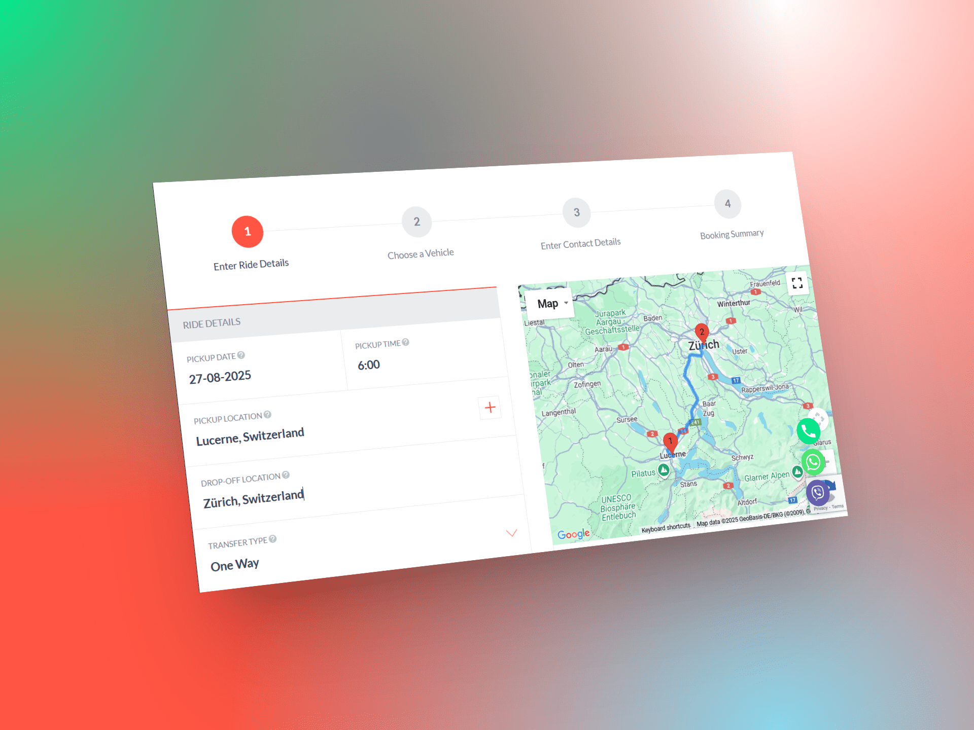Users can easily select ride type, pickup/drop-off locations, date, and preferred vehicle.Clear service overview: