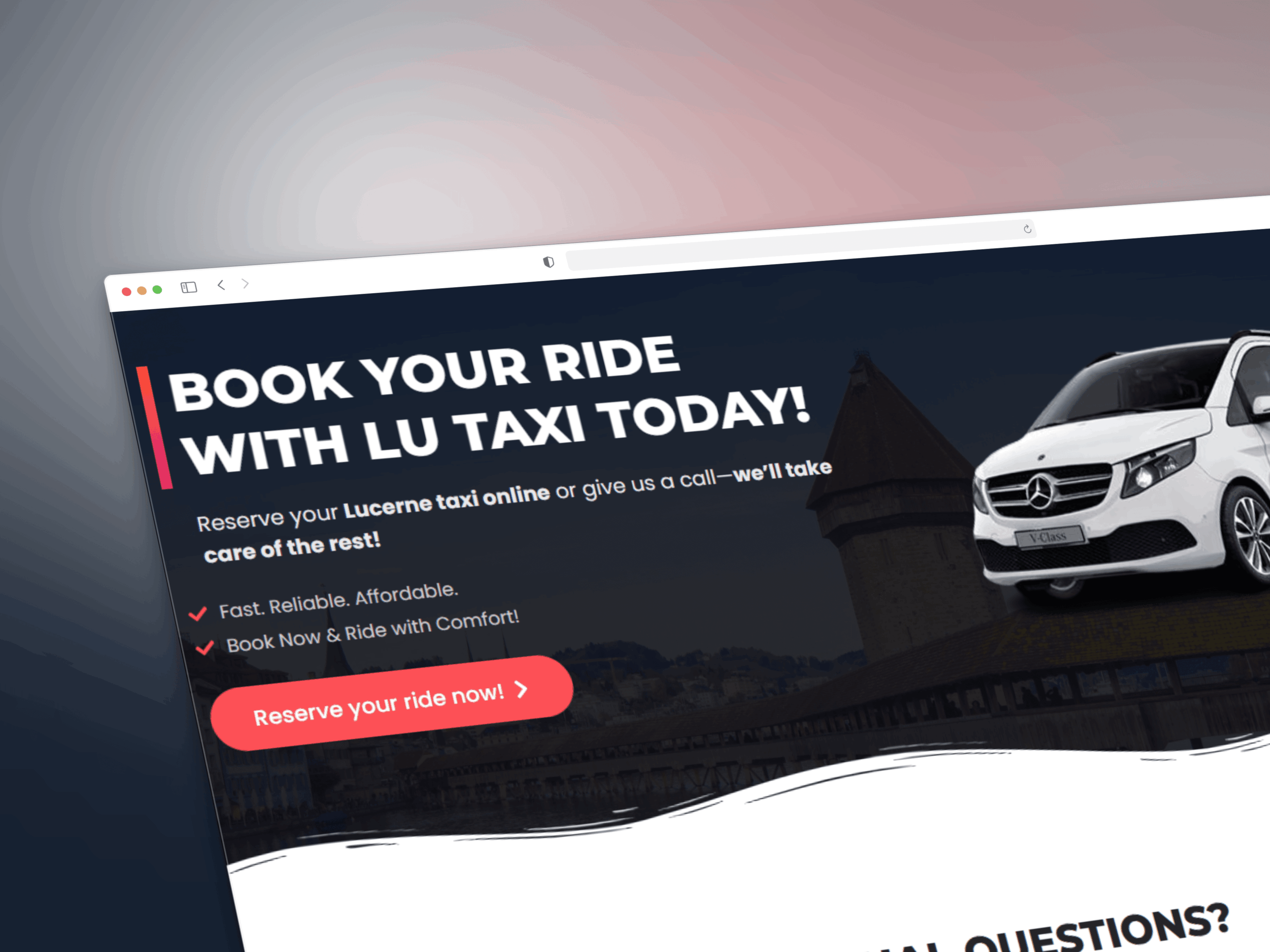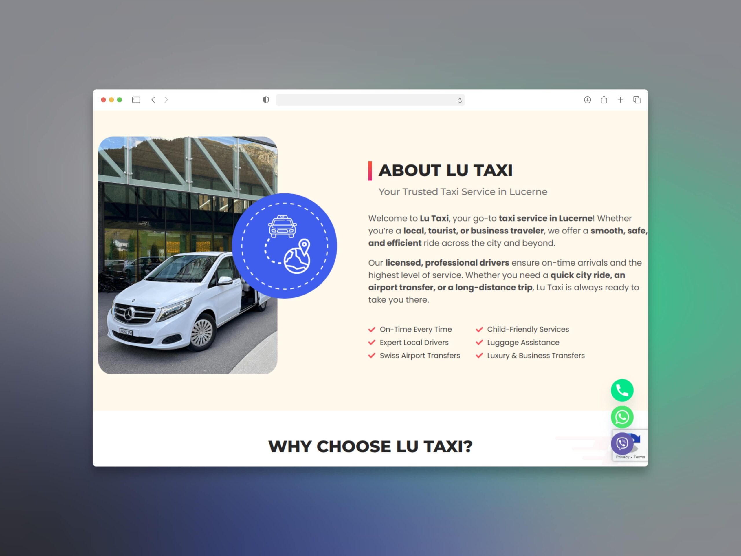 Lu Taxi is a professional taxi service in Lucerne, Switzerland, offering reliable transportation 24/7 for both locals and tourists. The website was designed as a multi-page business site, providing clear information about services, vehicle options, and an easy way to book rides online.