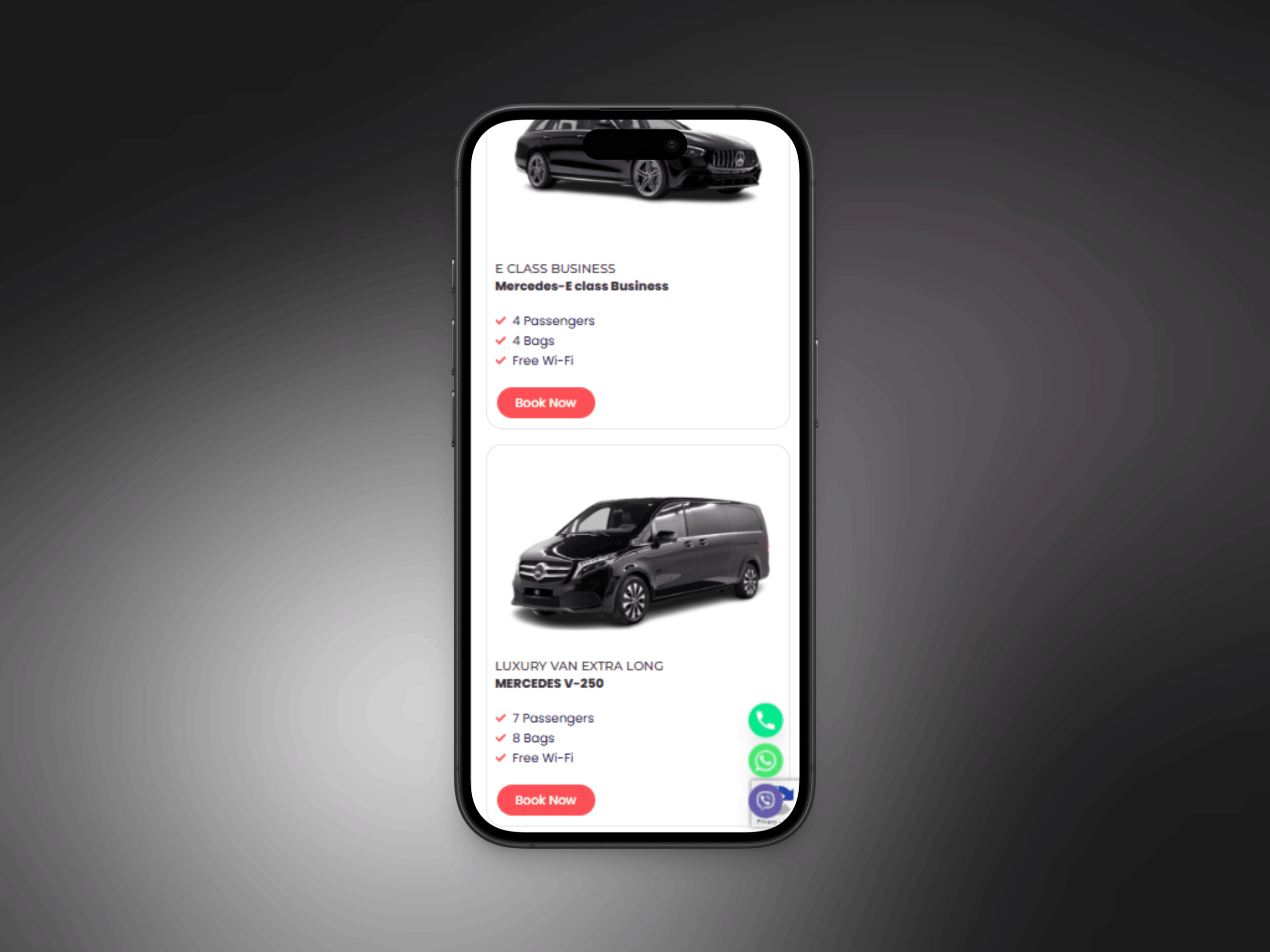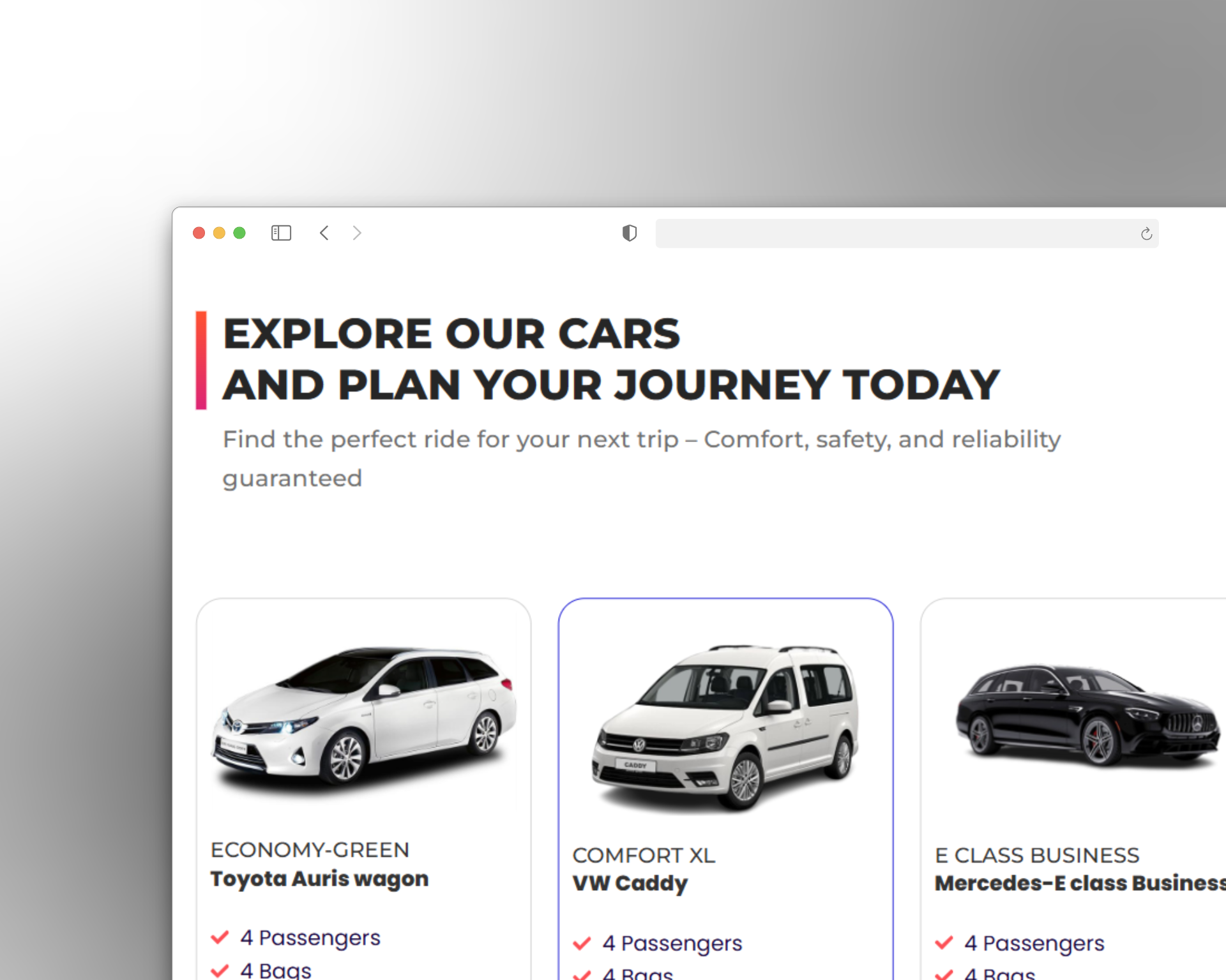 Airport transfers, long-distance rides, and city travel, each presented with corresponding vehicle types and options.Responsive web design: